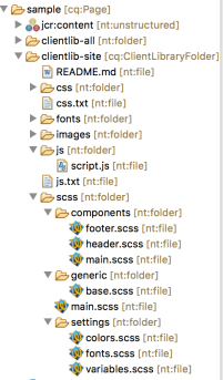 Create folders named scss and js under “src/main/content/jcr_root/etc/designs/sample/clientlib-site”